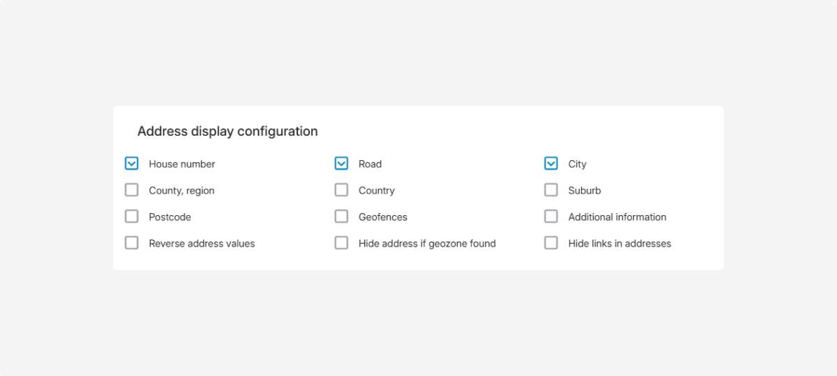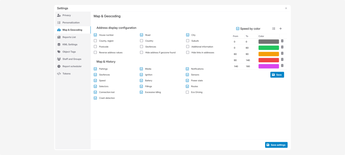 In the Map & Geocoding tab, find the Address display settings section2. Review the list of address components3. Check the boxes for the components you want to show4. Click Save settings in the Map & Geocoding tabIn the Map & History section, you can choose which event types will be shown in an object’s history.