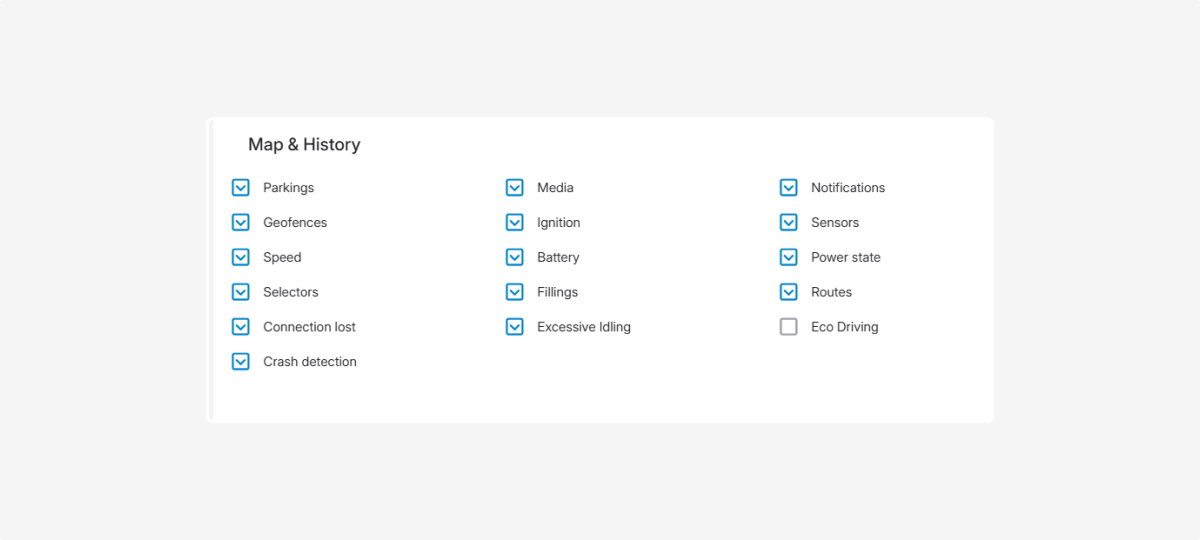 In the Map & Geocoding tab, find the Map & History section2. Select the event types to display in the object’s history — check the boxes you need.3. Click Save settings in the Map & Geocoding tab