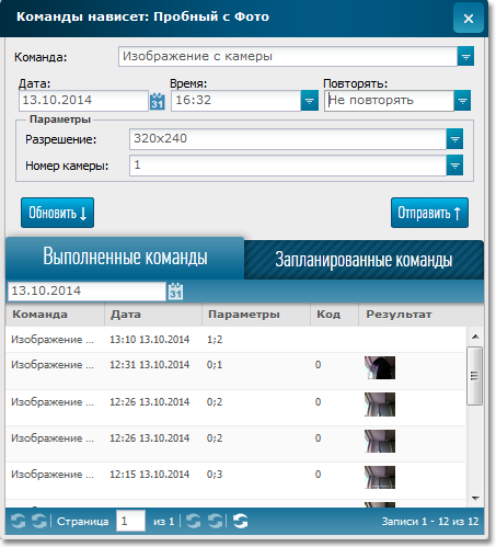 Select the desired date and time, with the specified resolution of the camera image, and select the camera number, then click the Send button. Wait some time for the command to arrive at the device and be processed. If necessary, in the drop-down list, set the repetition of sending the command at a certain interval: do not repeat, every hour, every 2 hours, every 4 hours, every 6 hours, every 8 hours, every 10 hours, every 12 hours.