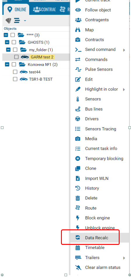Recalculation Go to the context menu of the object. Select the Data recalculation item. Recalculation can be done by trips and zones. • Select type. • Set number of days. • Press start. • Use history.