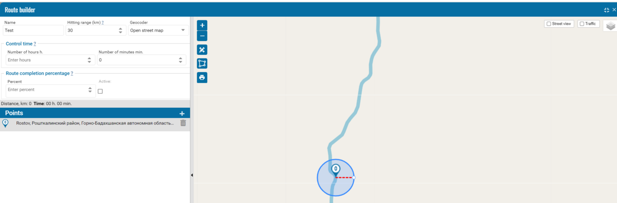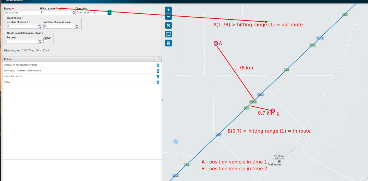• Detection range (km)* - the distance from the car to the nearest route point (not a checkpoint), which will be considered that the car is on the route. You can specify a fractional number.