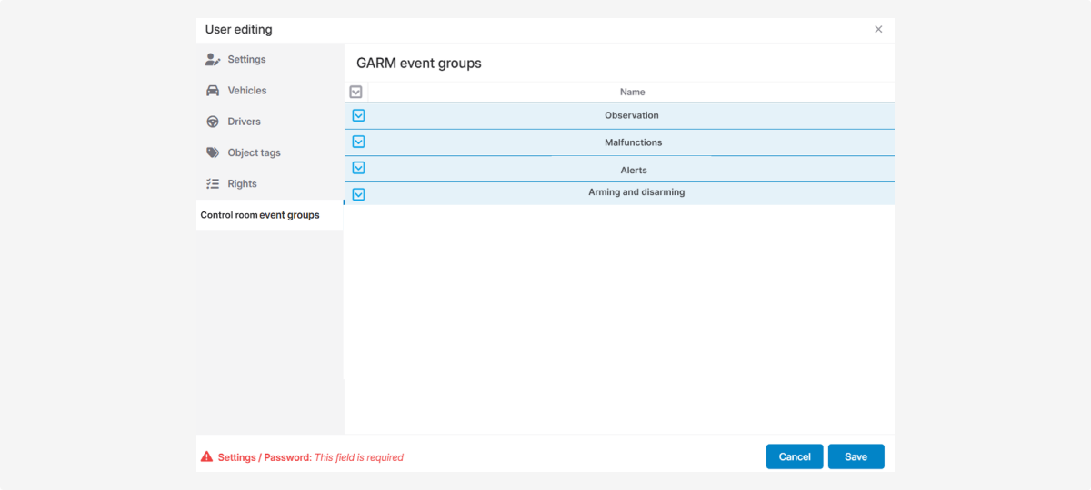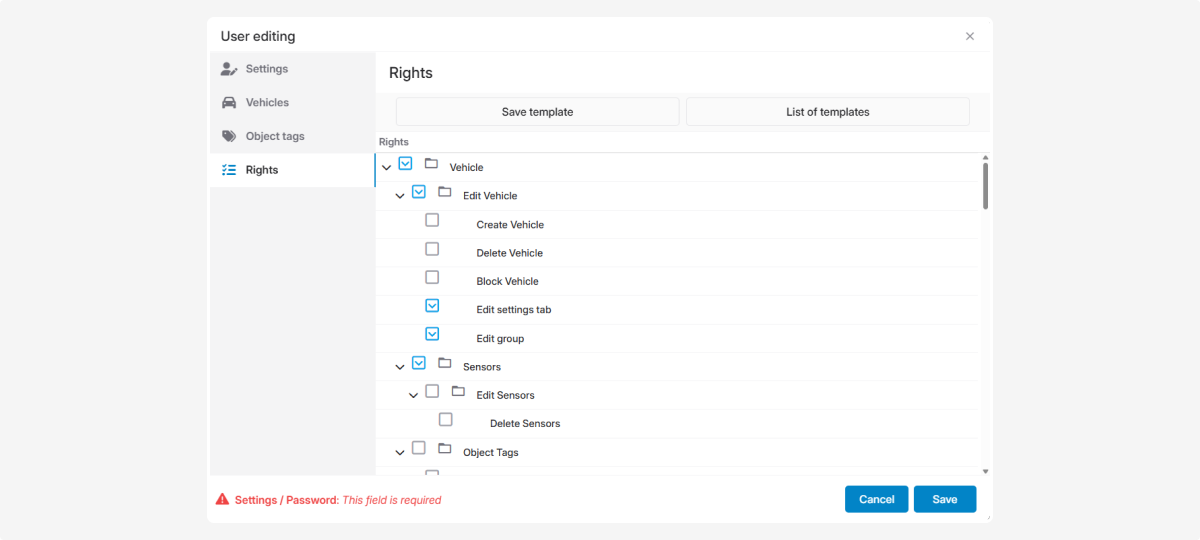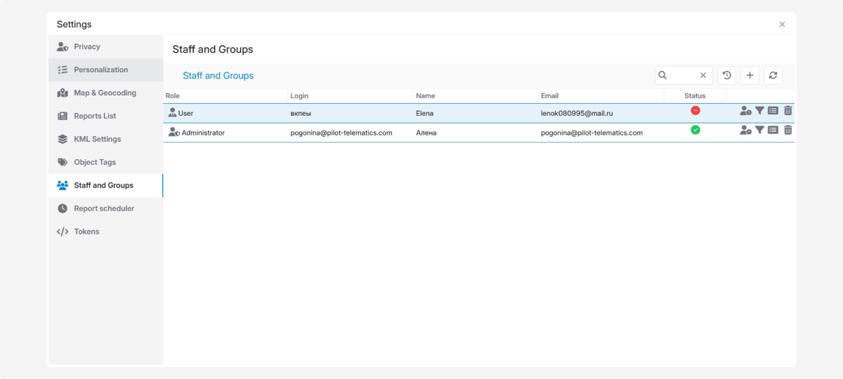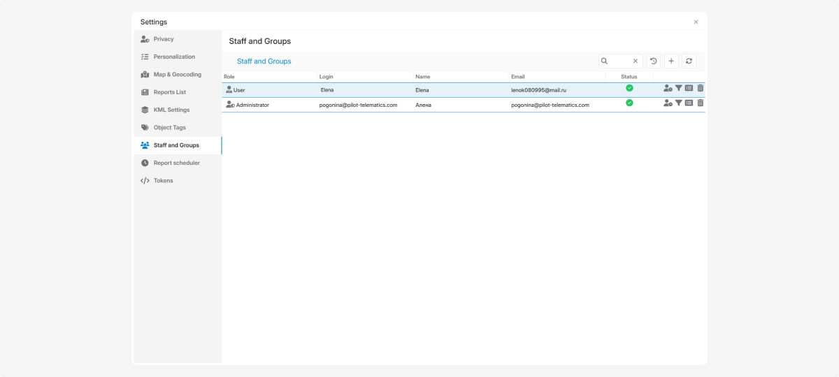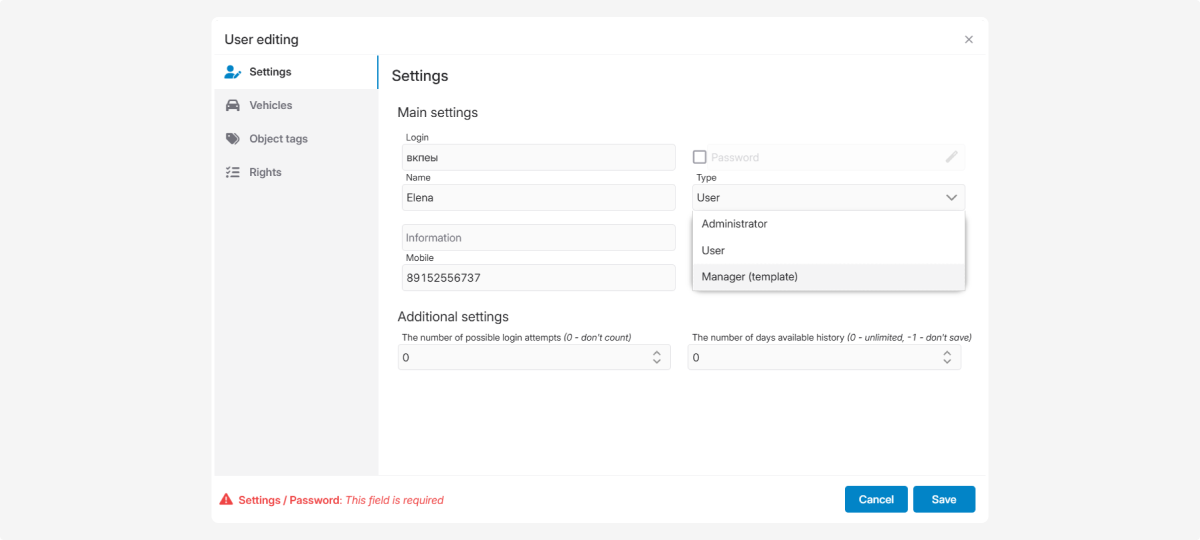 The user card lets you configure access for each employee (objects, tags, reports, view rights, etc.). You decide what information the user can see and what actions they can perform.