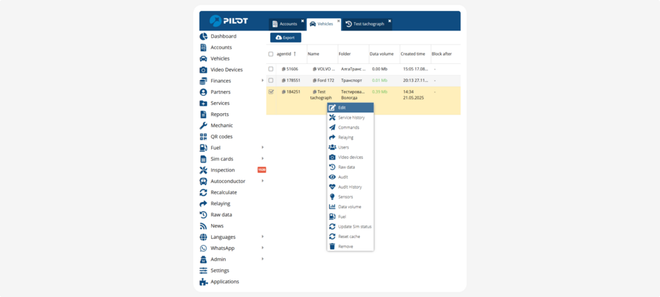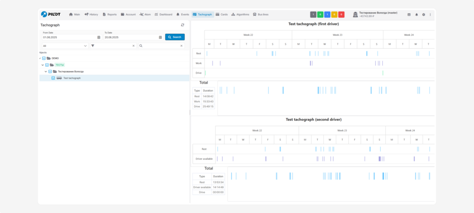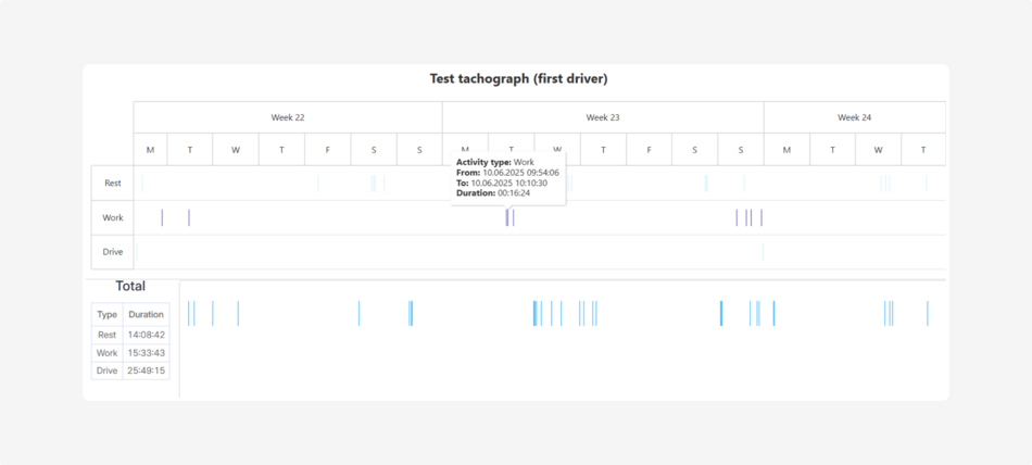 The Tachograph module lets you track and analyze driver activity using data from onboard equipment. All information comes directly from the tachograph — it cannot be edited manually. With this module, you can see when drivers are driving, resting, working, or waiting.
