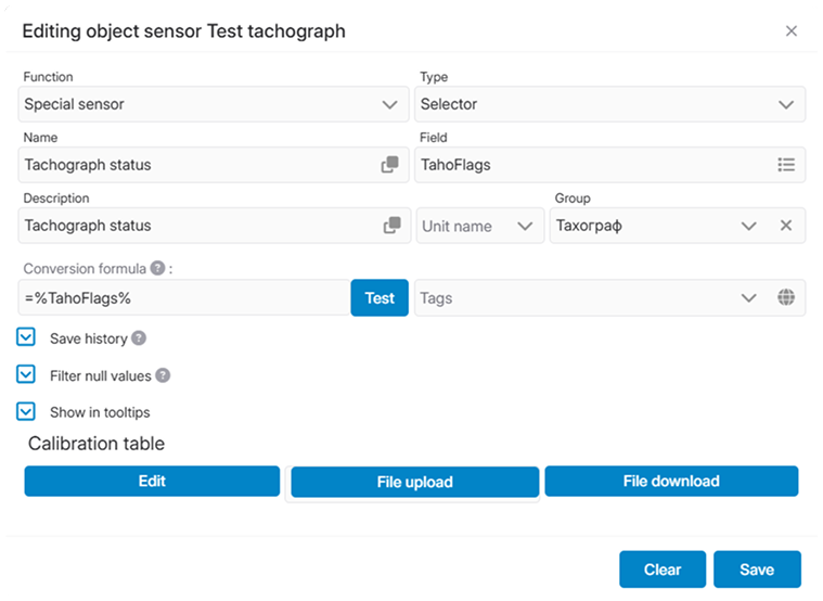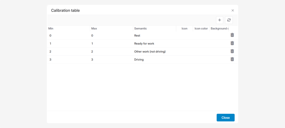 These data are also often used to build calibration tables. Calibration tables are required to convert the raw byte values from the tachograph into readable statuses.
