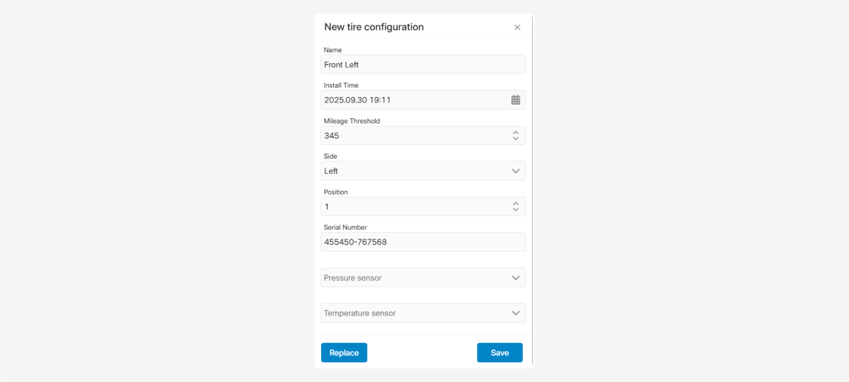 In this tab, you can track the condition of vehicle tires — monitor pressure and temperature indicators, as well as manage information about axles and tires.