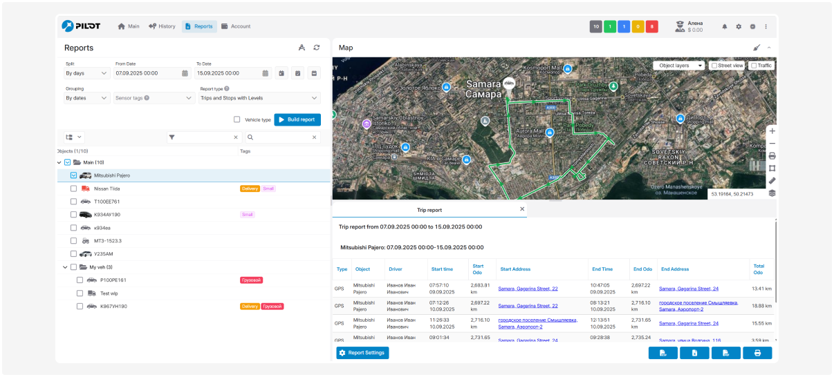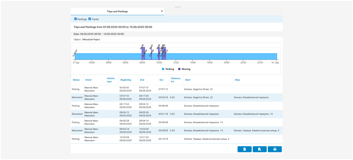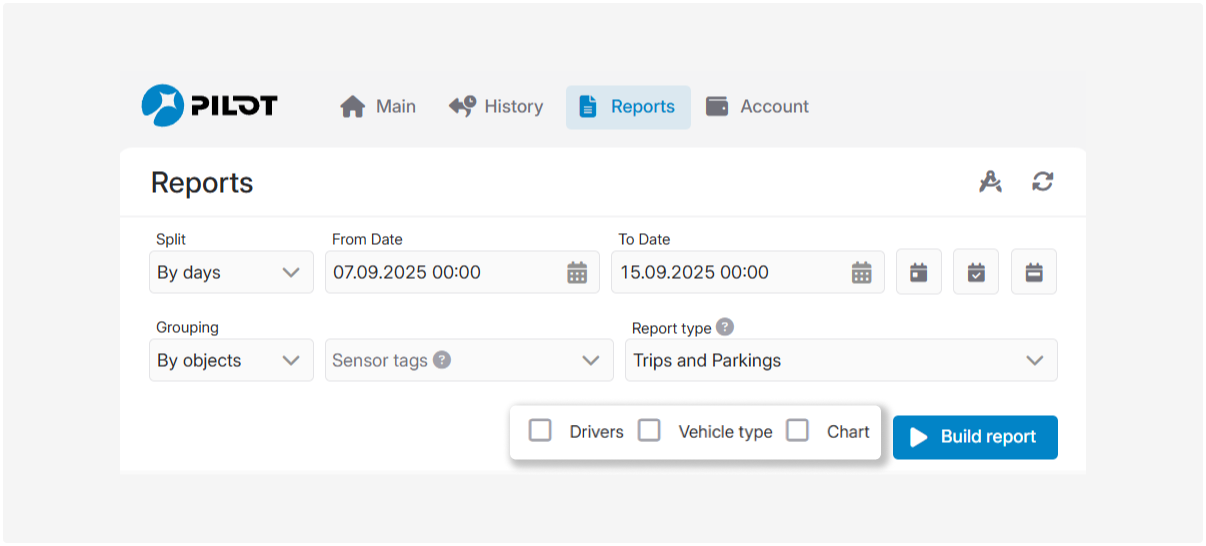 For example, in the Trips and parkings report, additional parameters are available: columns with drivers, vehicle type, and a chart.