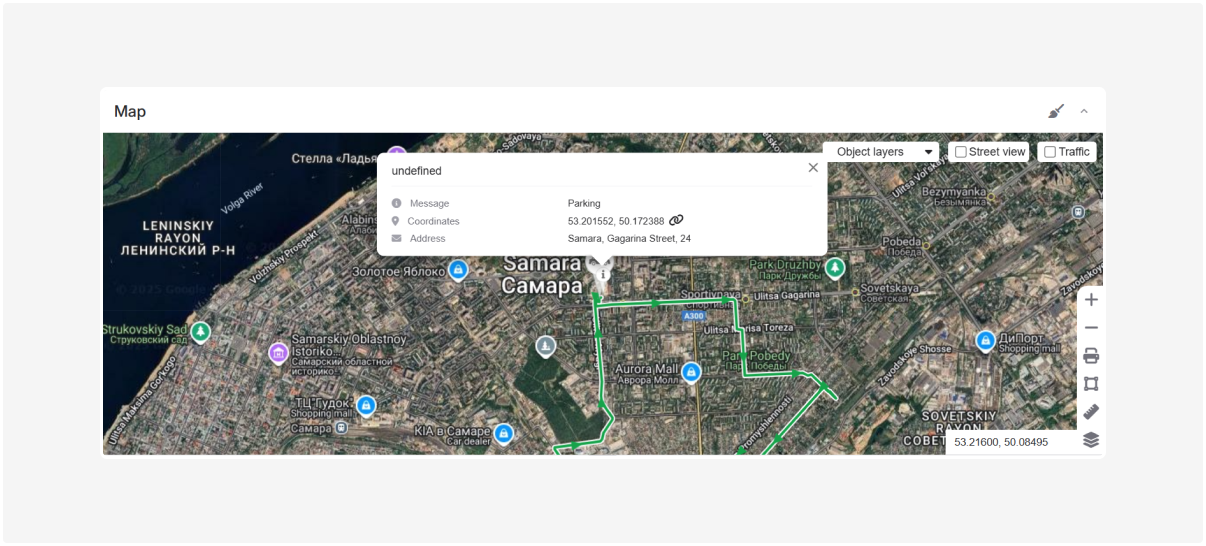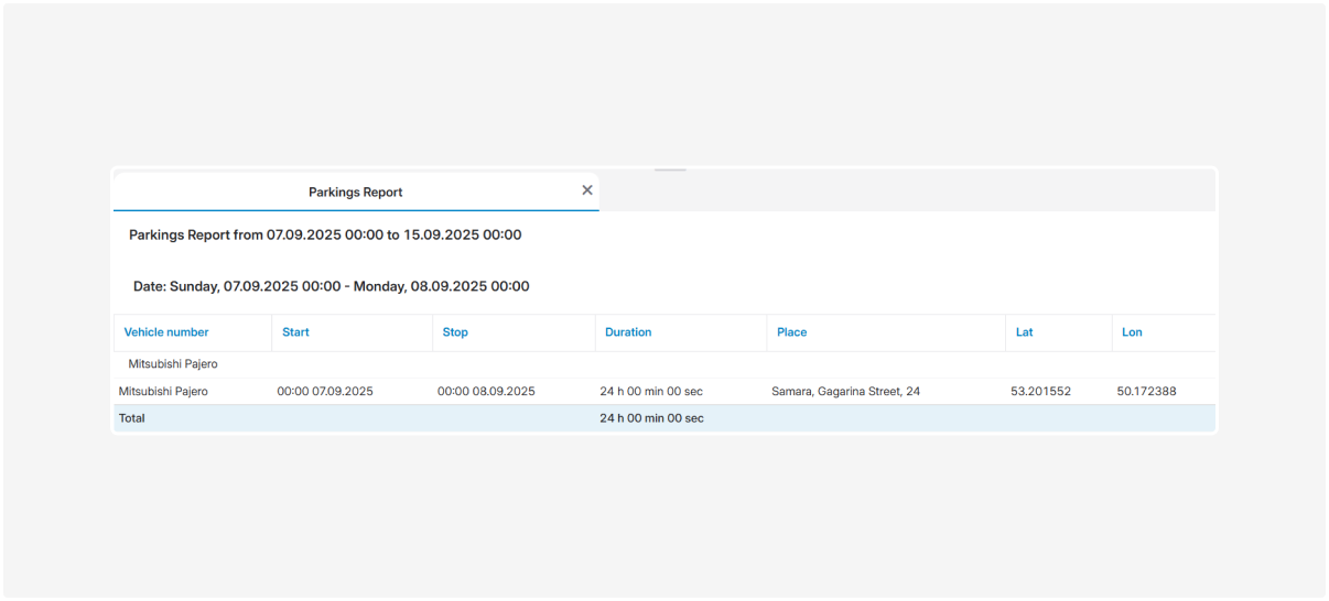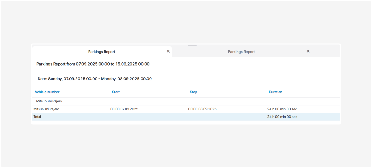 In Parkings reports, choose a record and a stop marker will appear on the map. Click it to view detailed information about the parking.