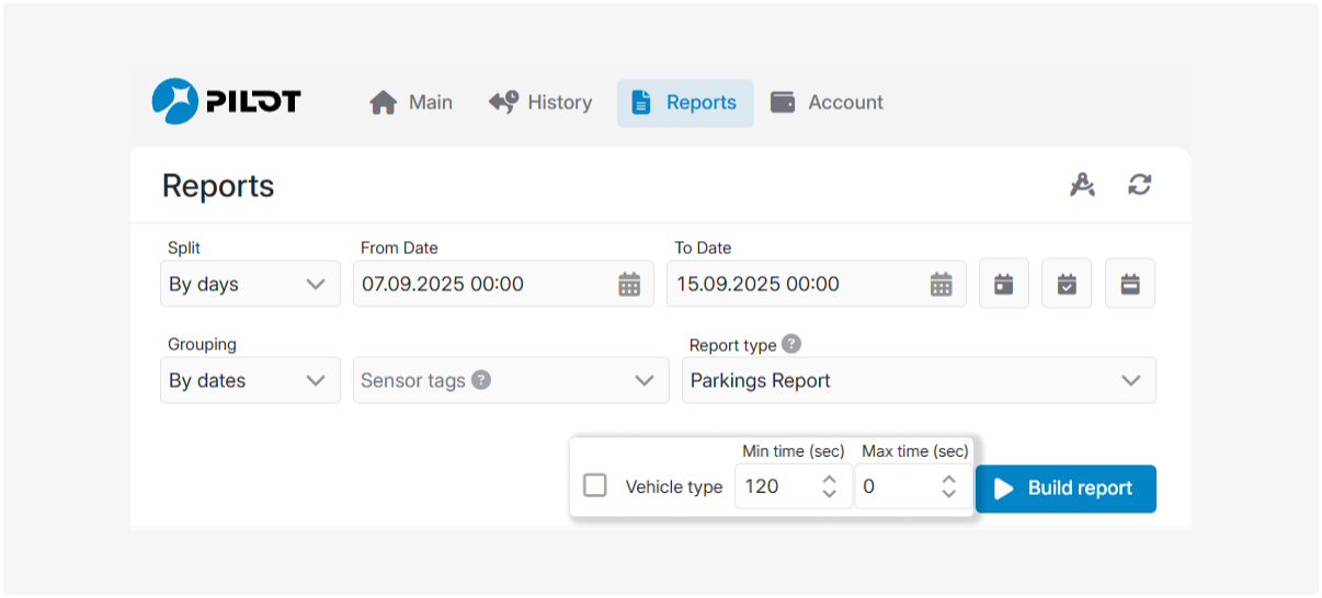 For example, in the parking report, you can specify Minimum time (sec) and, if needed, Maximum time (sec) that will be counted as parking.